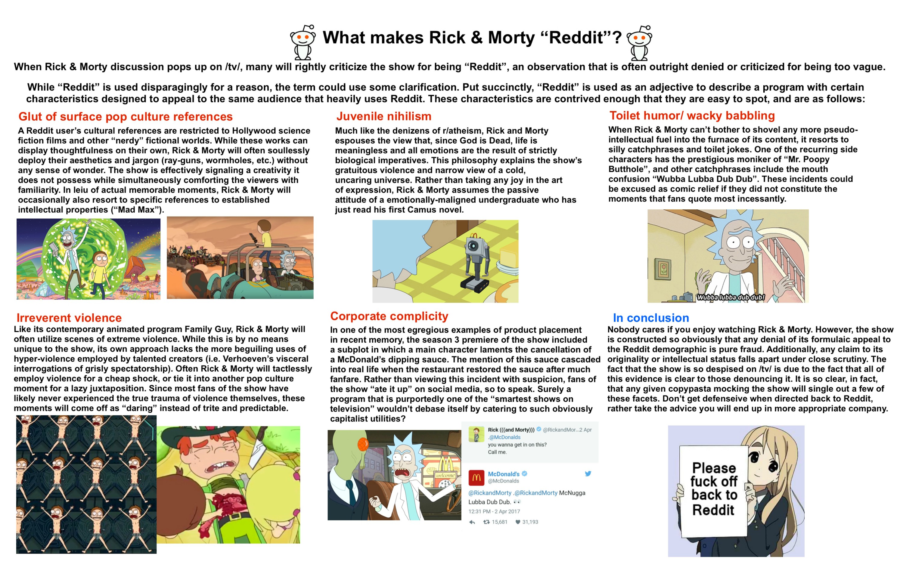 To be fair, you have to have a very high IQ to understand Rick and Morty. The humour is extremely subtle, and without a solid grasp of theoretical physics most of the jokes will go over a typical viewer’s head. There’s also Rick’s nihilistic outlook, which is deftly woven into his characterisation- his personal philosophy draws heavily from Narodnaya Volya literature, for instance. The fans understand this stuff; they have the intellectual capacity to truly appreciate the depths of these jokes, to realise that they’re not just funny- they say something deep about LIFE. As a consequence people who dislike Rick & Morty truly ARE idiots- of course they wouldn’t appreciate, for instance, the humour in Rick’s existential catchphrase “Wubba Lubba Dub Dub,” which itself is a cryptic reference to Turgenev’s Russian epic Fathers and Sons. I’m smirking right now just imagining one of those addlepated simpletons scratching their heads in confusion as Dan Harmon’s genius wit unfolds itself on their television screens. What fools.. how I pity them. 😂
